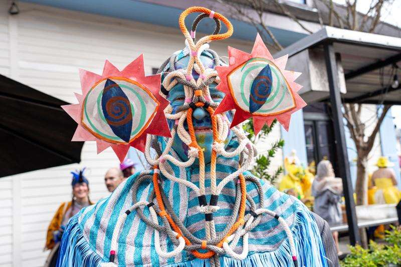 As a man, dressed like a crawfish — including red fabric claws for hands — caught one of the coconuts, he waved it around, the gold glitter on the husk glistening in the sun.