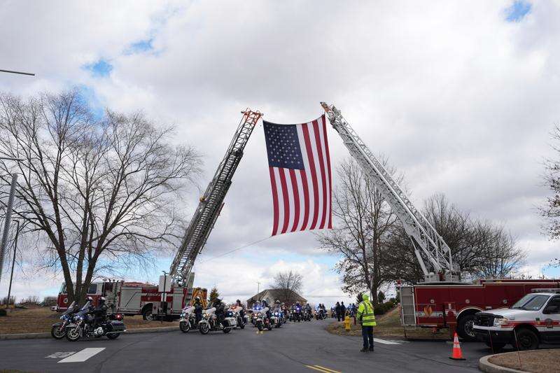 FILE - The police procession arrives for the funeral of West York Borough Police Officer Andrew Duarte at Living Word Community Church, in Red Lion, Pa., Feb. 28, 2025. (AP Photo/Matt Rourke, File)