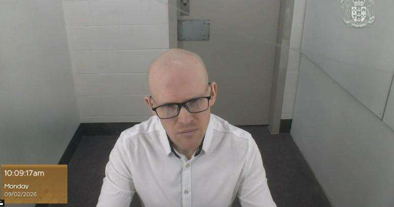 In this photo made from video and provided by the New Zealand Court of Appeal, Monday, Feb. 9, 2026, Brenton Tarrant appears before the court by video from Auckland Prison in Auckland. (New Zealand Court of Appeal via AP)