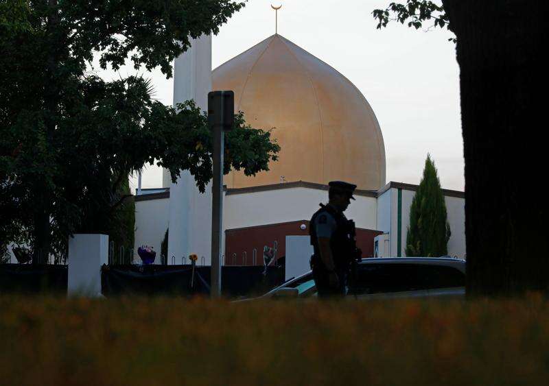 FILE - A police officer stands guard in front of the Al Noor mosque, in Christchurch, New Zealand, March 17, 2019. (AP Photo/Vincent Yu, File)