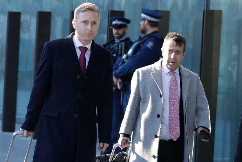 FILE - Jonathan Hudson, left, and Shane Tait, then defense lawyers for Brenton Tarrant, arrive at the Christchurch District Court in Christchurch, New Zealand, Aug. 15, 2019. (AP Photo/Mark Baker, File)