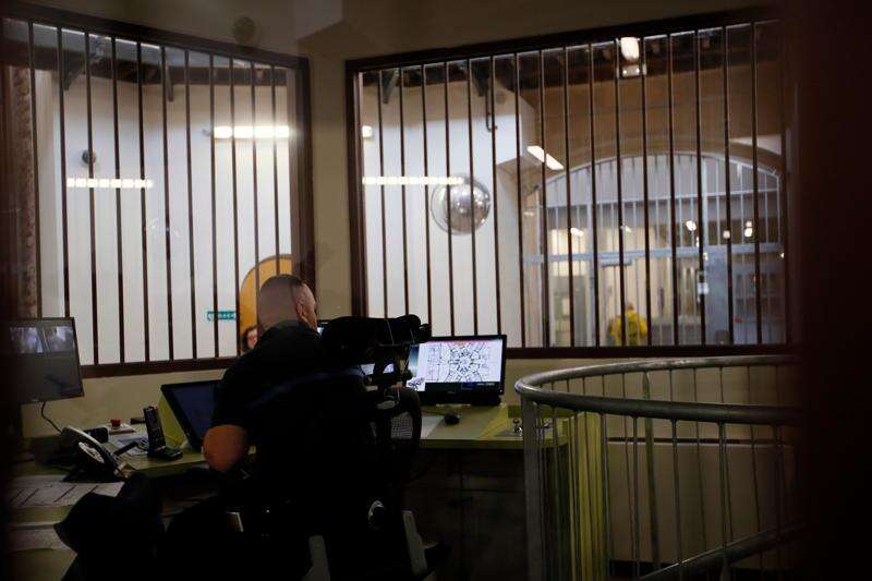 FILE - A prison service guard checks the security screens at the entrance of La Sante prison during a press visit after a four-year renovation project in Paris, Friday, April 12, 2019. (AP Photo/Francois Mori, File)