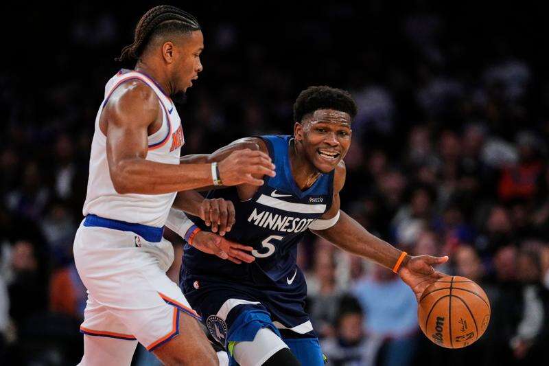 New York Knicks' Miles McBride, left, defends Minnesota Timberwolves' Anthony Edwards during the first half of a preseason NBA basketball game Thursday, Oct. 9, 2025, in New York. (AP Photo/Frank Franklin II)