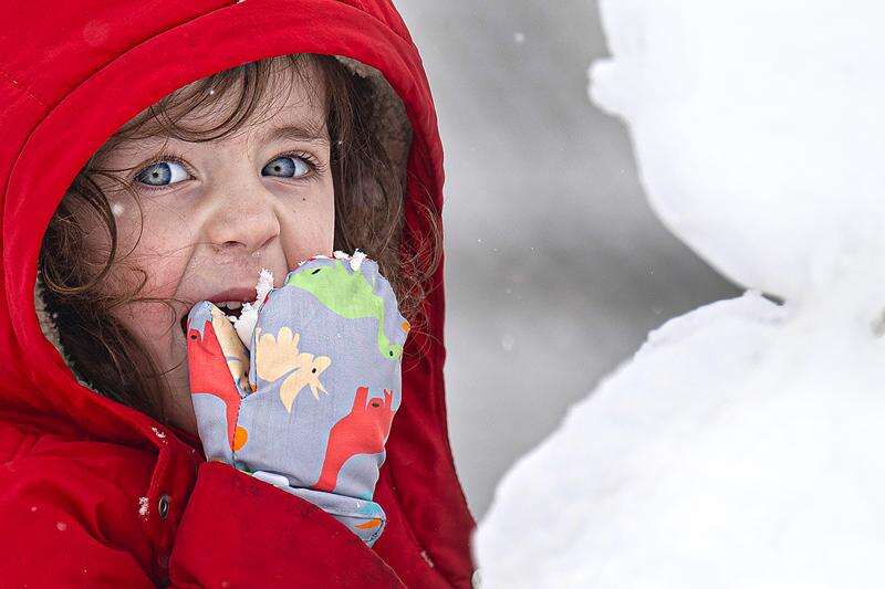 Louise Jordan, 3, eats snow while building a snowman near her home in Media, Pa. on Monday, Feb. 23, 2026. (Jose F. Moreno/The Philadelphia Inquirer via AP)