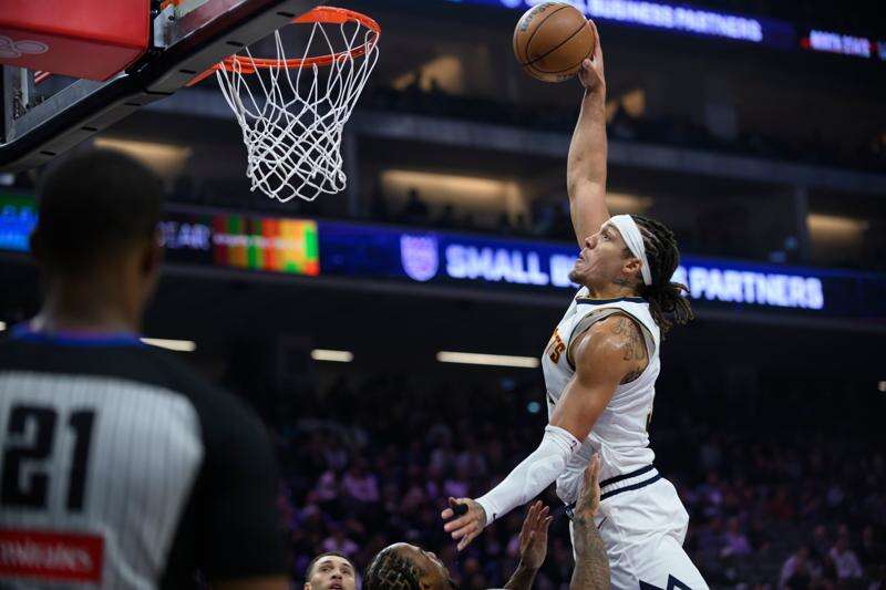 Denver Nuggets forward Aaron Gordon dunks over Sacramento Kings defenders during the first half of an NBA basketball game in Sacramento, Calif., Tuesday, Nov. 11, 2025. (AP Photo/Randall Benton)