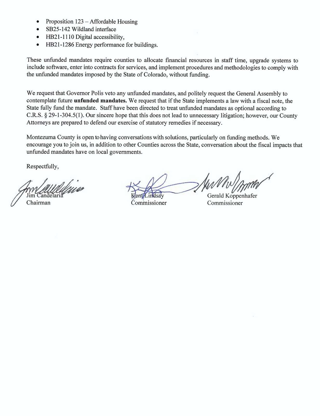 Montezuma County commissioners spelled out those concerns clearly in an Aug. 26 letter to Gov. Jared Polis and legislative leaders. The letter cites an expanding list of unfunded mandates imposed through legislation and rulemaking, including SB20-217 on enhanced law enforcement integrity, HB21-1250 on law enforcement accountability, HB24-1054 on jail standards, Proposition 123 on affordable housing, SB25-142 on wildland-urban interface regulations, HB21-1110 on digital accessibility requirements and HB21-1286 on building energy performance standards.