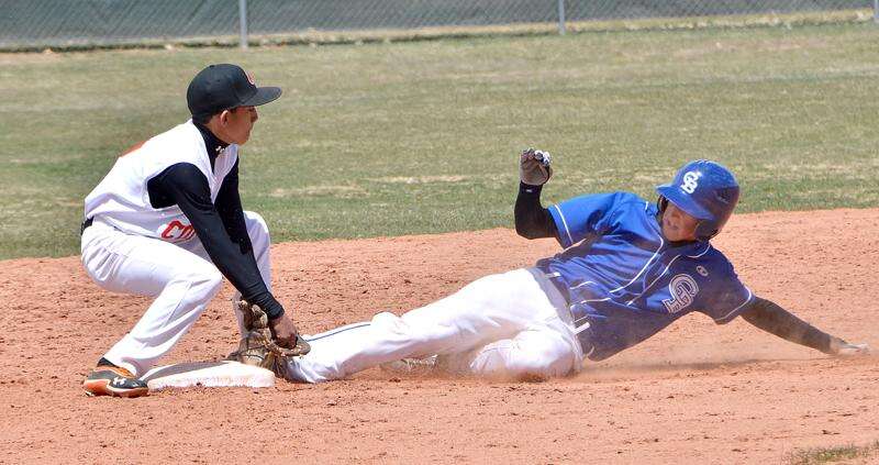 A Cedaredge runner just makes it into second ahead of the tag by Kevin Morales on Saturday. The Panthers won the game over the Bruins, 8-3, at McAndrew Field.