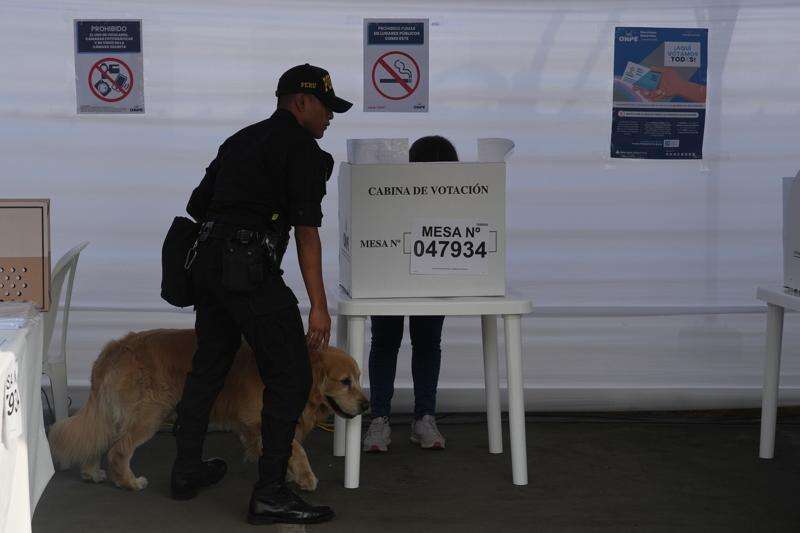 Police inspects a polling station during general elections in Lima, Peru, Sunday, April 12, 2026. (AP Photo/Guadalupe Pardo)