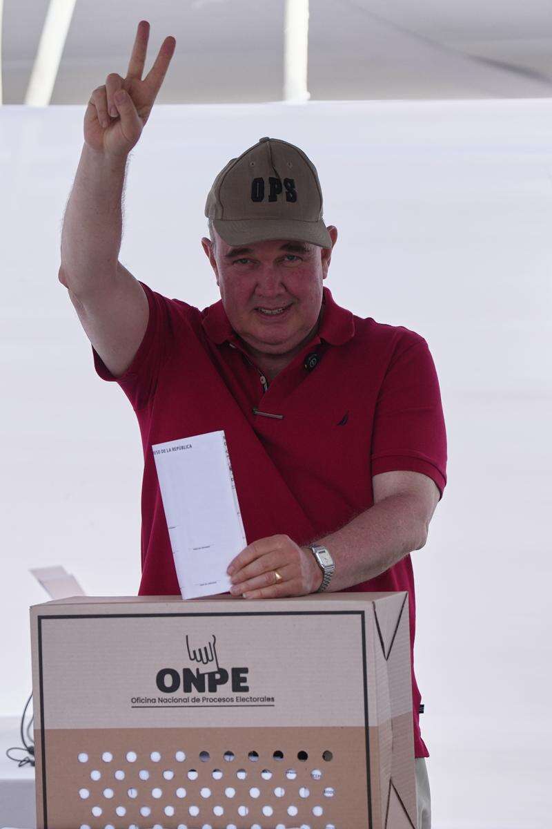 Rafael Lopez Aliaga, presidential candidate of the Popular Renewal, votes during general elections in Lima, Peru, Sunday, April 12, 2026. (AP Photo/Guadalupe Pardo)