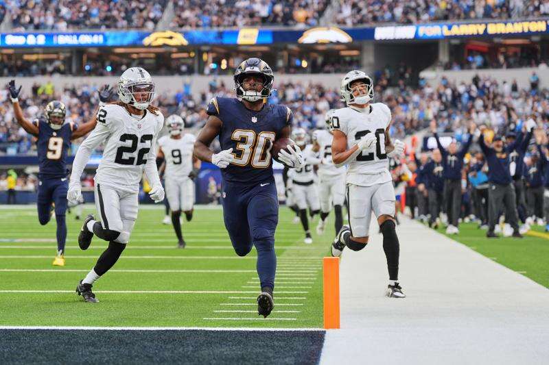 Los Angeles Chargers running back Kimani Vidal (30) scores a touchdown against the Las Vegas Raiders during the second half of an NFL football game, Sunday, Nov. 30, 2025, in Inglewood, Calif. (AP Photo/Jae C. Hong)