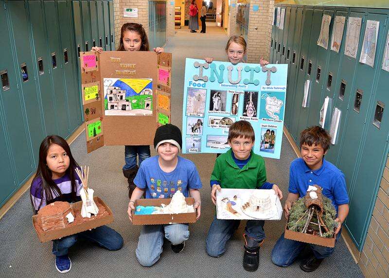 Fourth-grade students at Kemper Elementary recently made and reported on Native American homes for their Colorado history class. In back are Isabelle Wilson and Olivia Yarbrough, and in front are Savannah Billings, Johnny Graves, Atticus Keel and James McLaughlin.