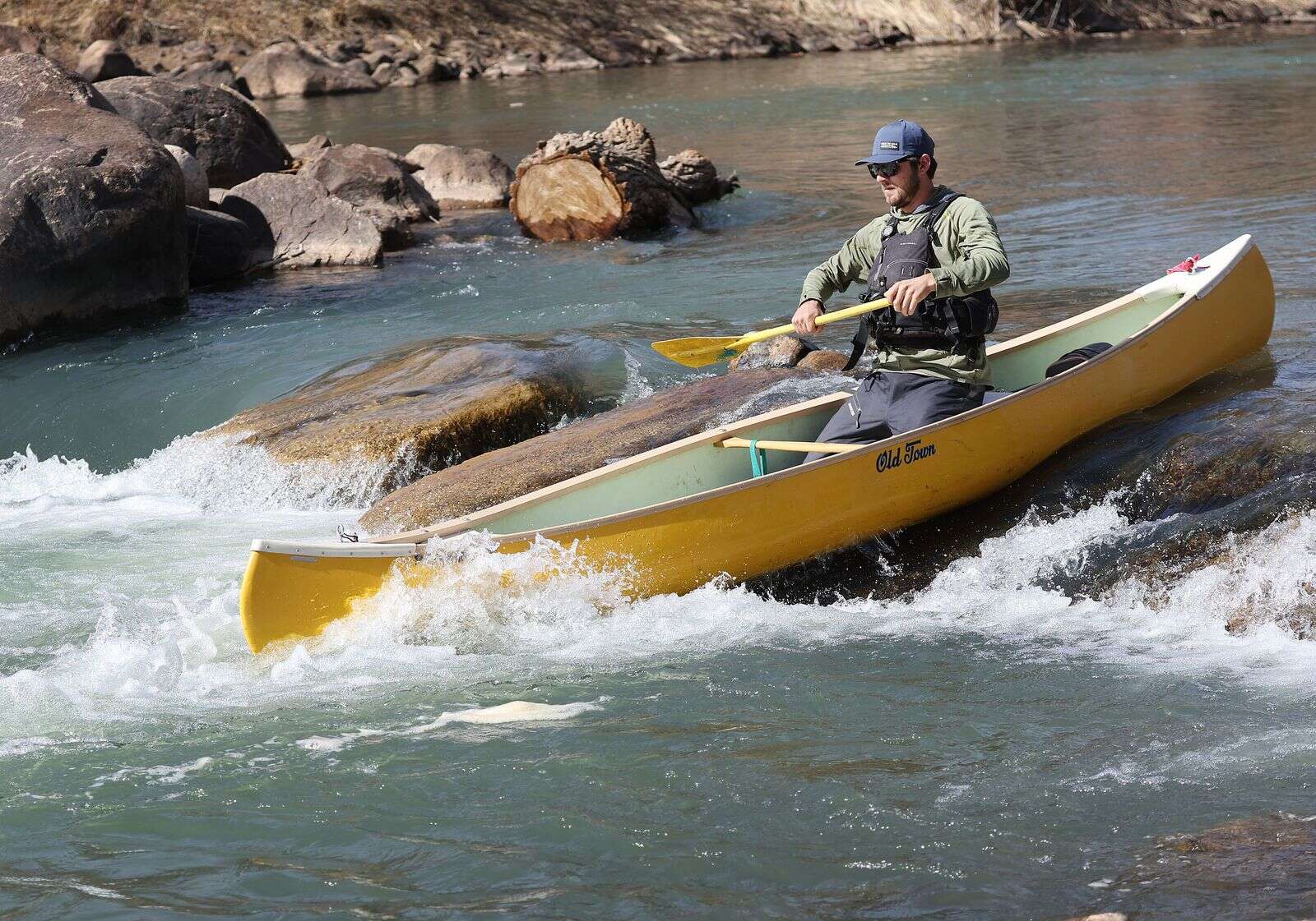 Trey Roberts goes over a water feature while canoeing the Animas River on a warm Friday afternoon in Durango. (Jerry McBride/Durango Herald)