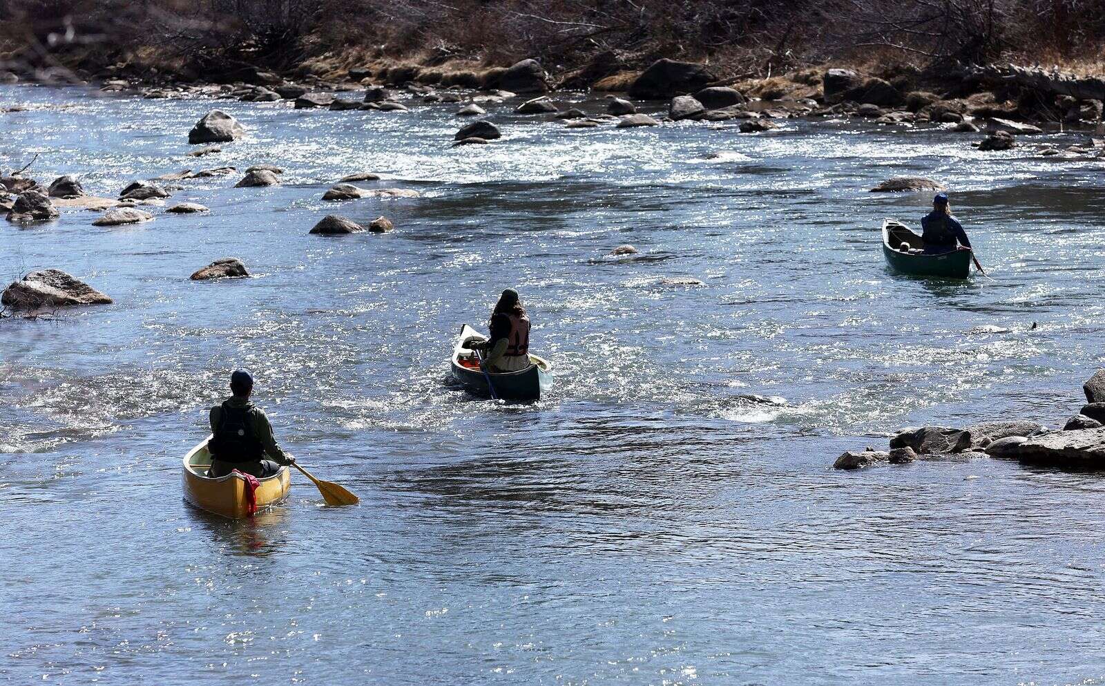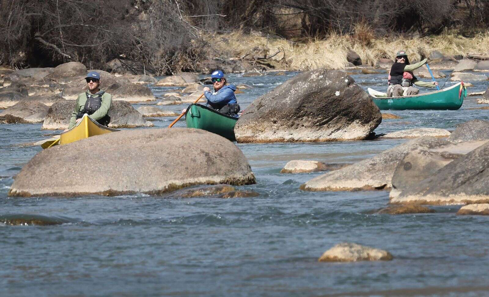 Trey Roberts, left, Marcos Vanata, center, and Marcos Thiele canoe down the Animas River on a warm Friday afternoon. (Jerry McBride/Durango Herald)