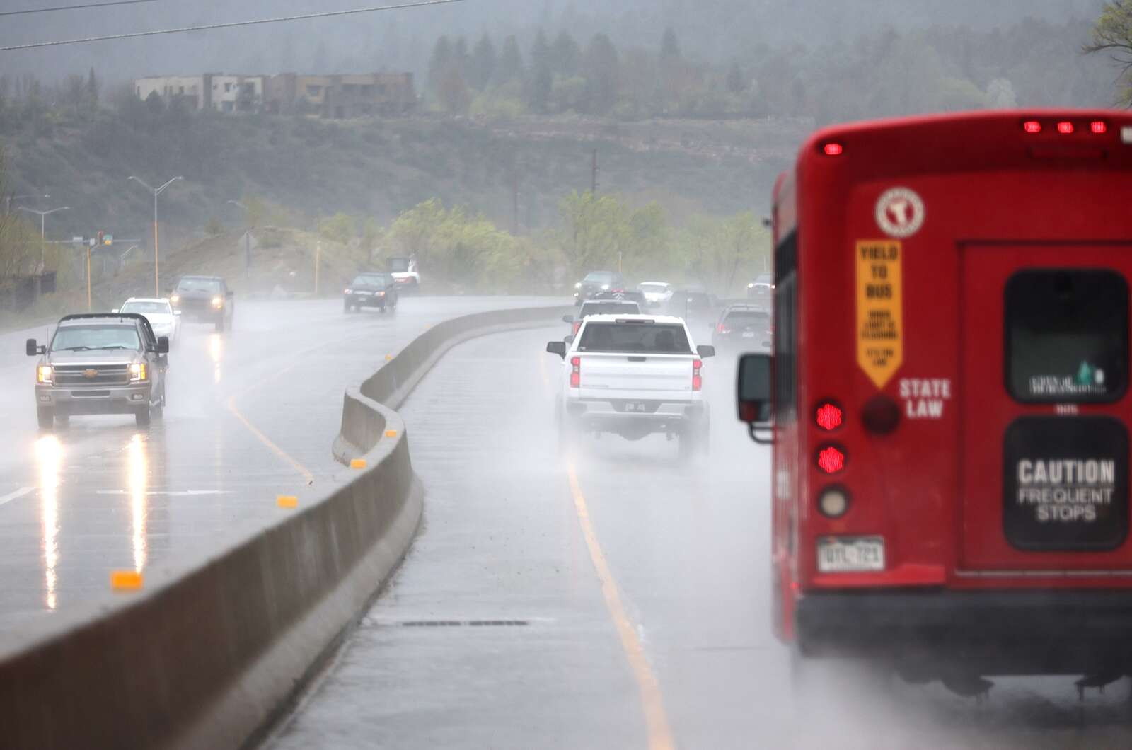 Rain-slick roads in Durango on Wednesday as a spring storm moves through the area with snow falling in the higher elevations. (Jerry McBride/Durango Herald)
