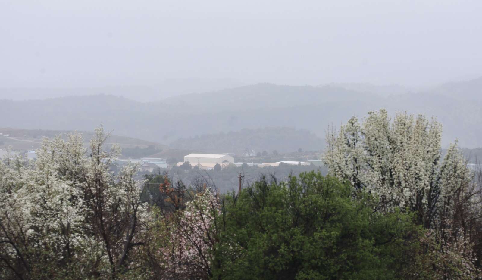Rain falling north of Durango on Wednesday brightens up blooming trees after a very dry period. (Jerry McBride/Durango Herald)