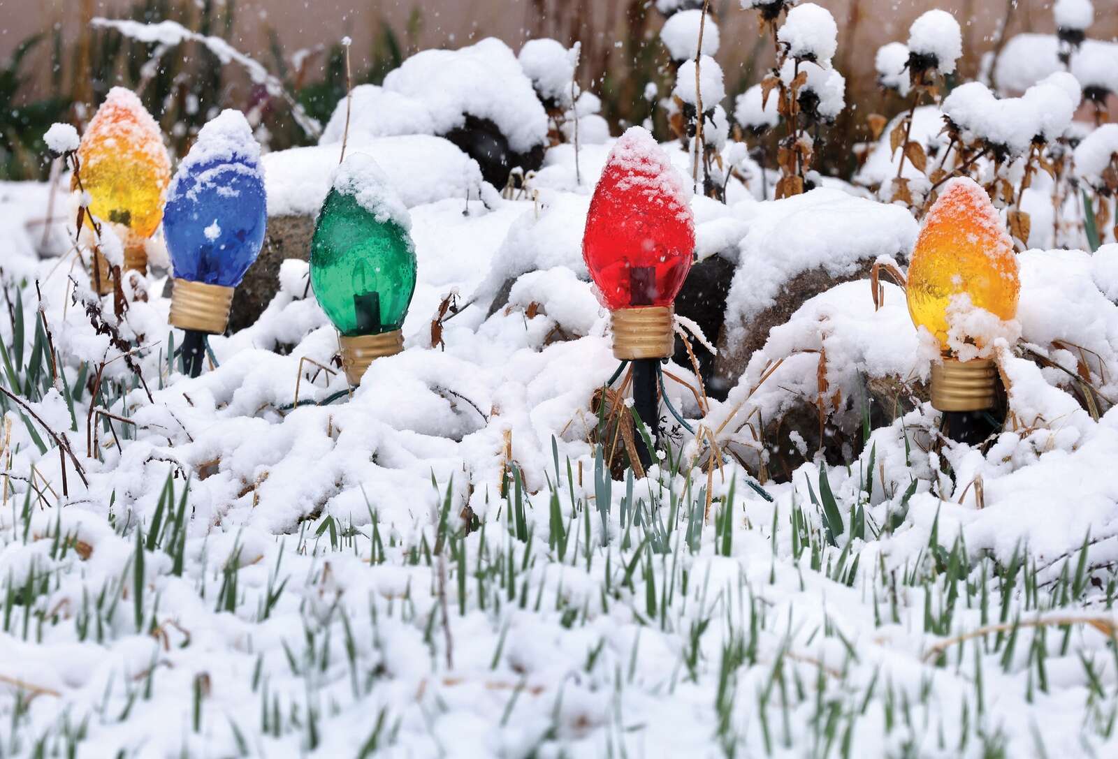 Snow begins to accumulate on Christmas lights and green grass in Mayday near the La Plata Mountains on Wednesday as a spring storm moves through the area. (Jerry McBride/Durango Herald)