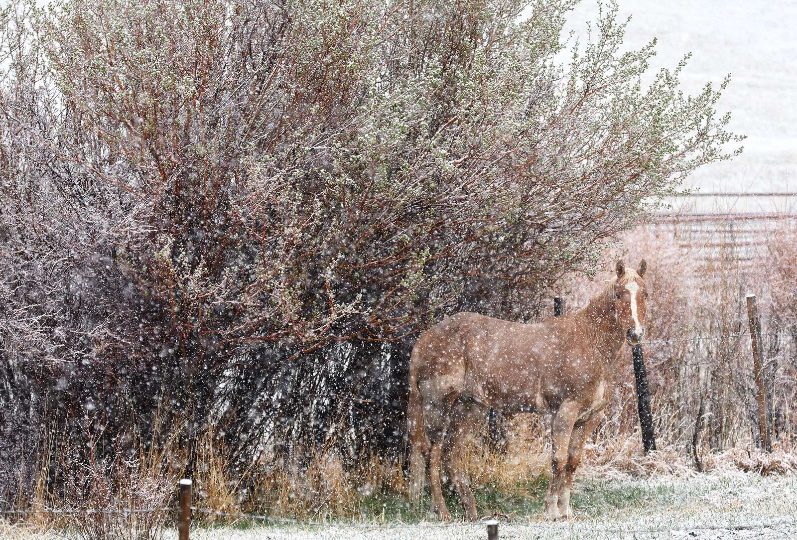 A horse shelters from the blowing snow near Hesperus on Wednesday as a spring storm moves through the area. (Jerry McBride/Durango Herald)