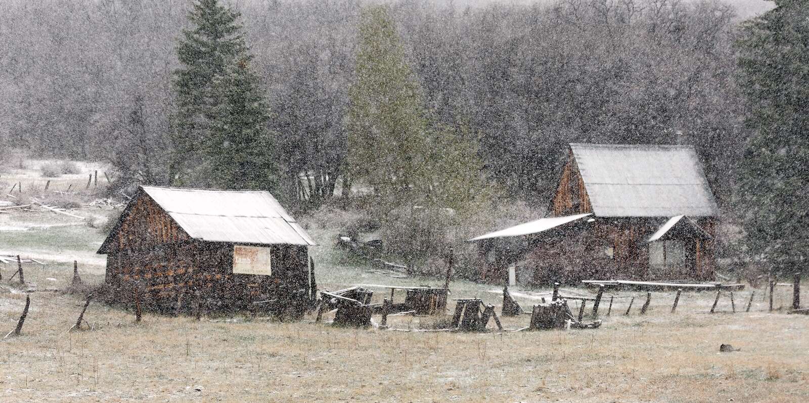 Snow falls on an old cabin near Hesperus Ski Area on Wednesday as a spring storm moves through the area with snow falling in the higher elevations. (Jerry McBride/Durango Herald)