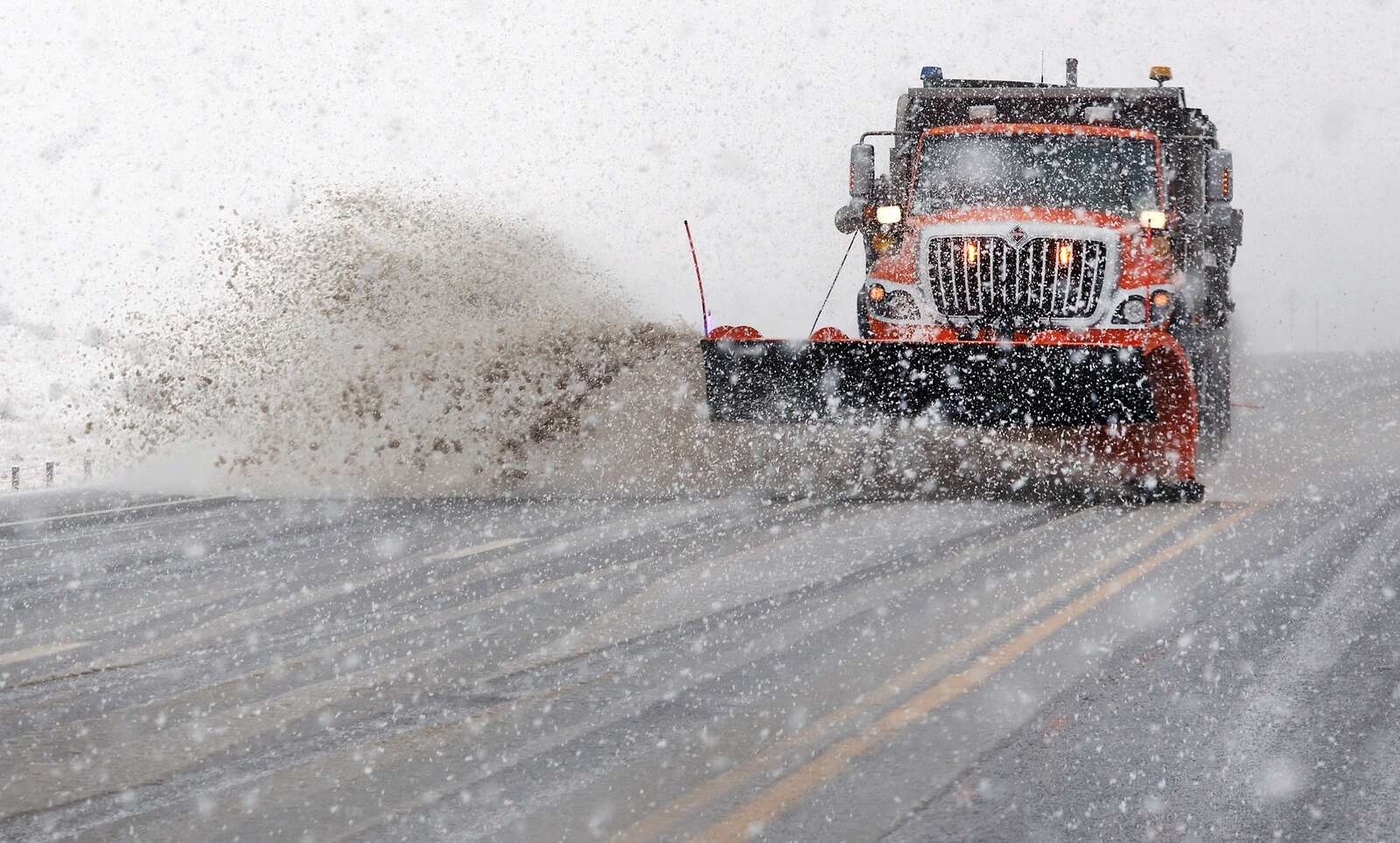 A Colorado Department of Transportation snowplow clears U.S. Highway 160 west of Durango on Wednesday as a spring storm moves through the area. (Jerry McBride/Durango Herald)