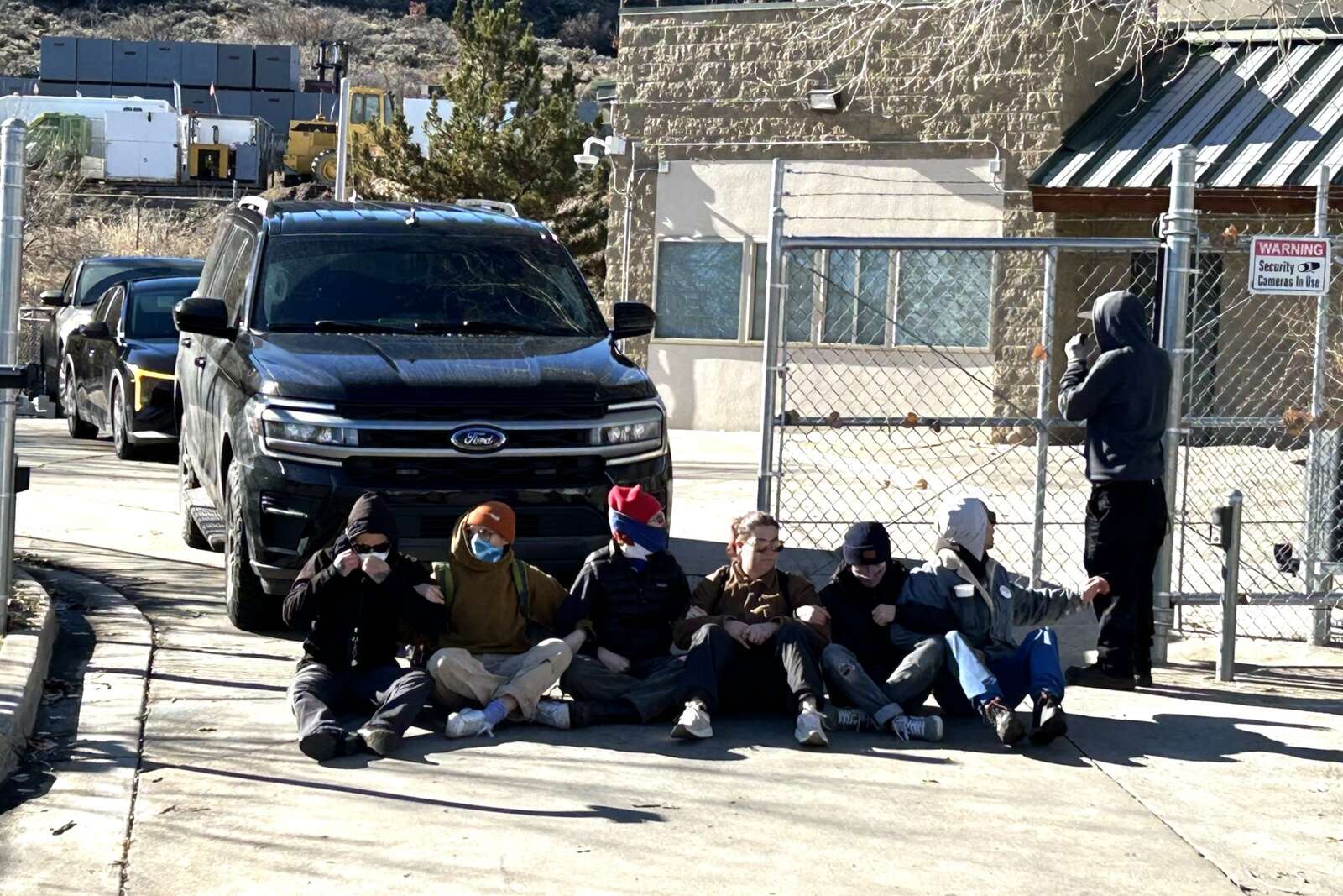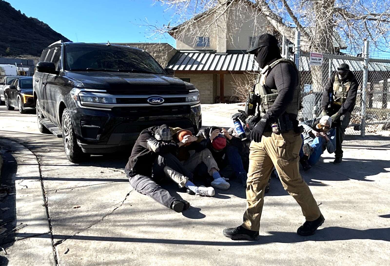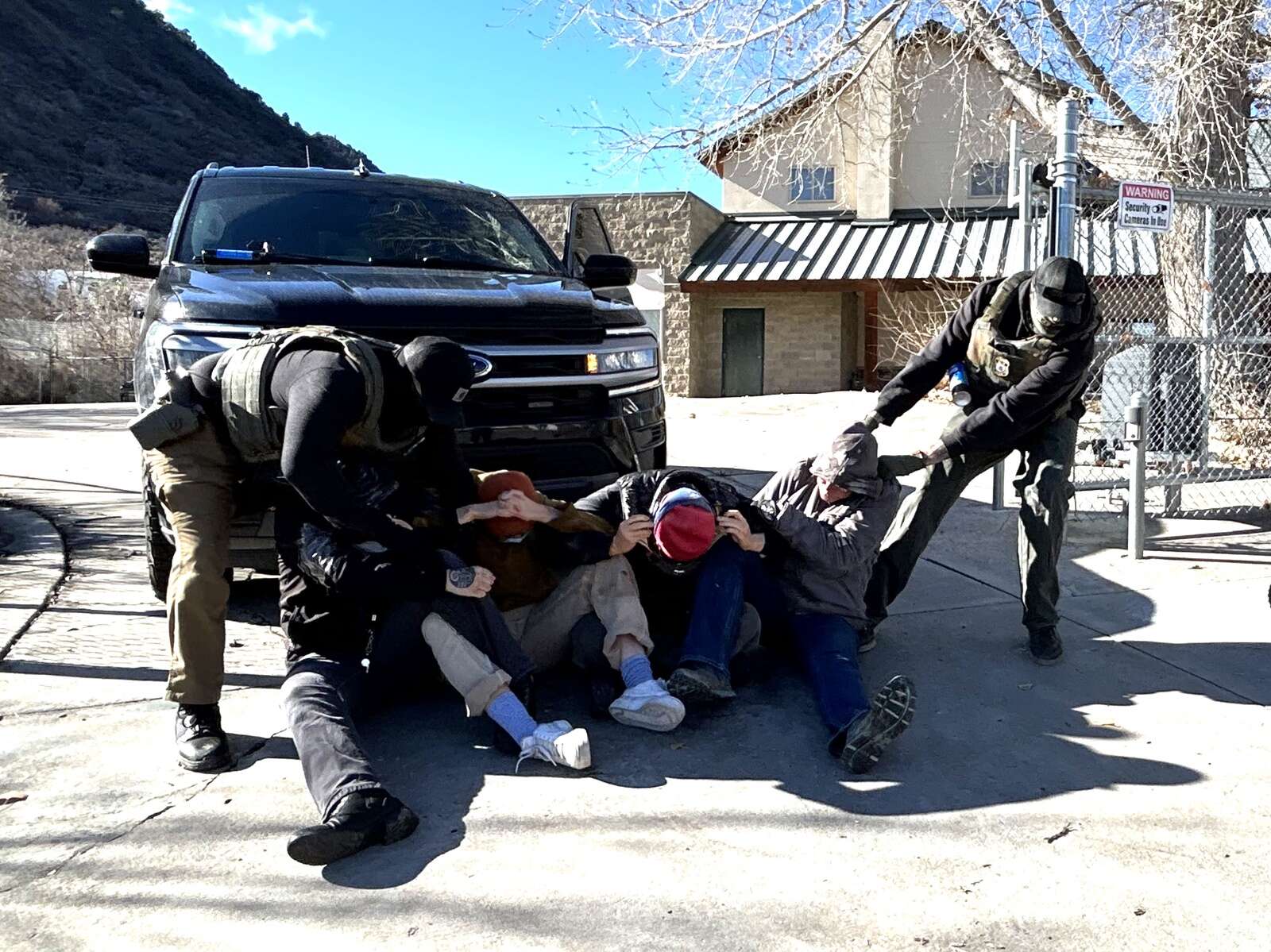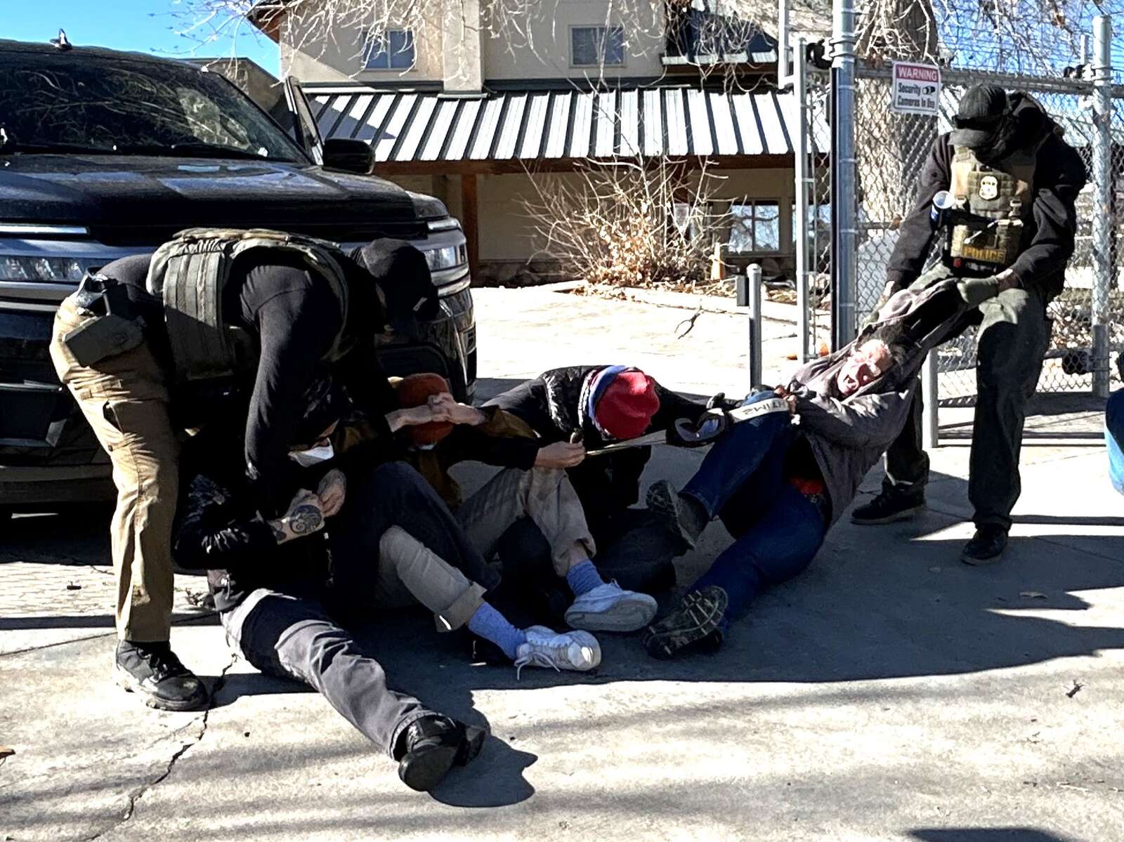 U.S. Immigration and Customs Enforcement officers remove protesters after they linked arms and sat in front of the ICE field office driveway Friday in Durango. (Shane Benjamin/Durango Herald)