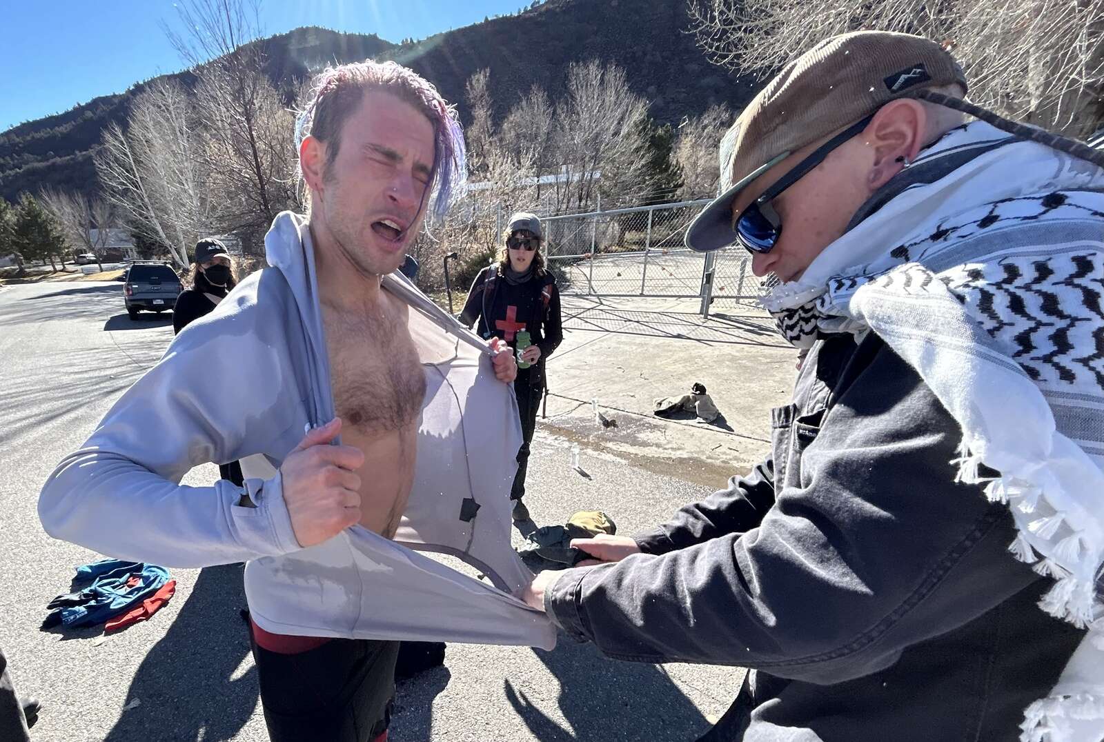 A protester who declined to be identified has his shirt cut off after being pepper sprayed outside the U.S. Immigration and Customs Enforcement field office Friday in Durango. (Shane Benjamin/Durango Herald)