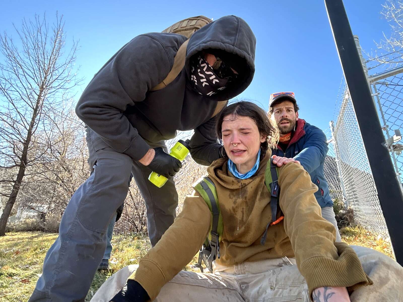 A protester who asked not to be identified by name has her eyes rinsed with water after being pepper sprayed outside the U.S. Immigration and Customs Enforcement field office Friday in Durango. (Shane Benjamin/Durango Herald)