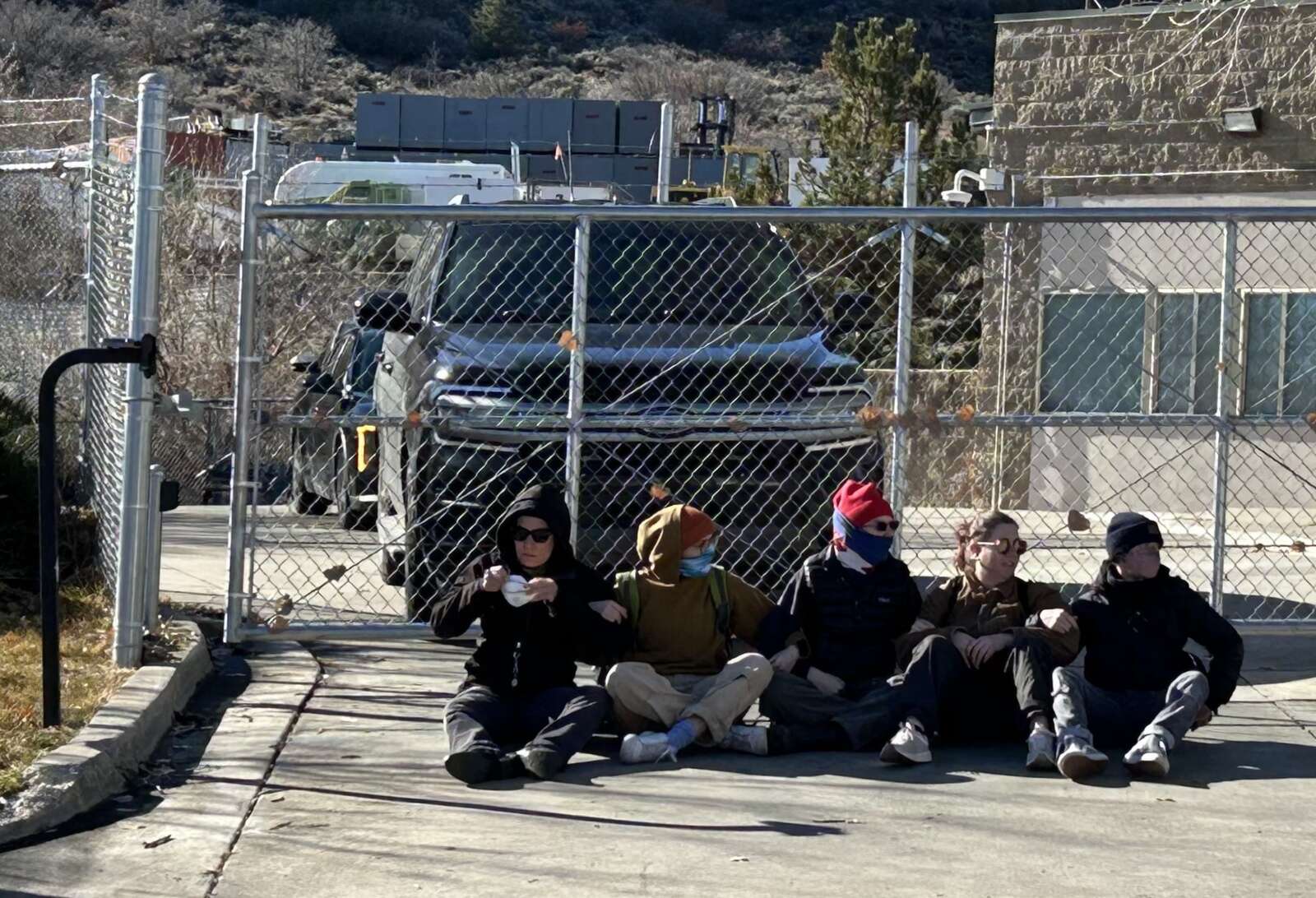 Protesters link arms and prepare to block vehicles from leaving the U.S. Immigration and Customs Enforcement field office Friday in Durango. (Shane Benjamin/Durango Herald)