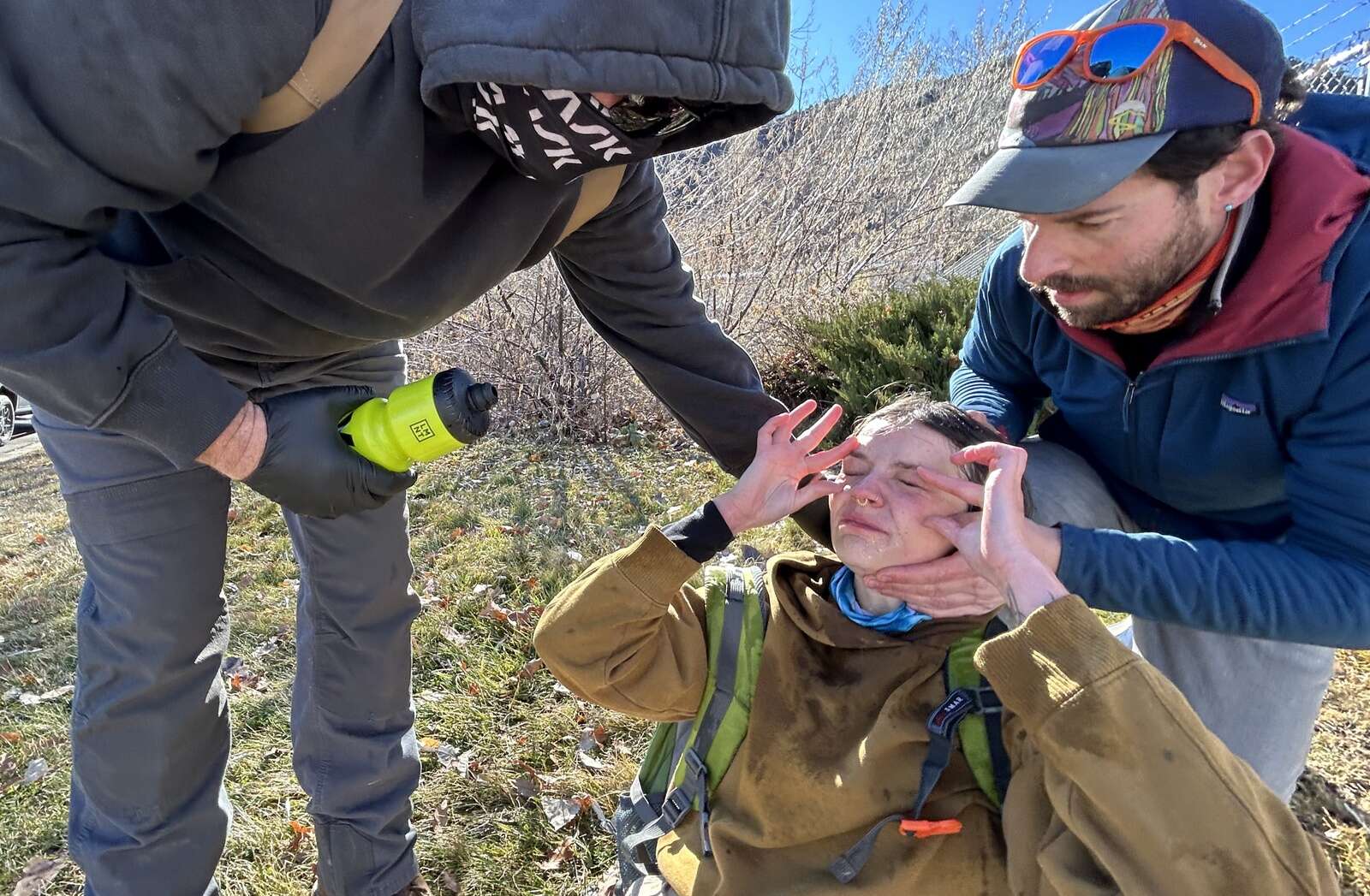 A protester who declined to be identified has his eyes rinsed with water after being pepper sprayed outside the U.S. Immigration and Customs Enforcement field office Friday in Durango. (Shane Benjamin/Durango Herald)