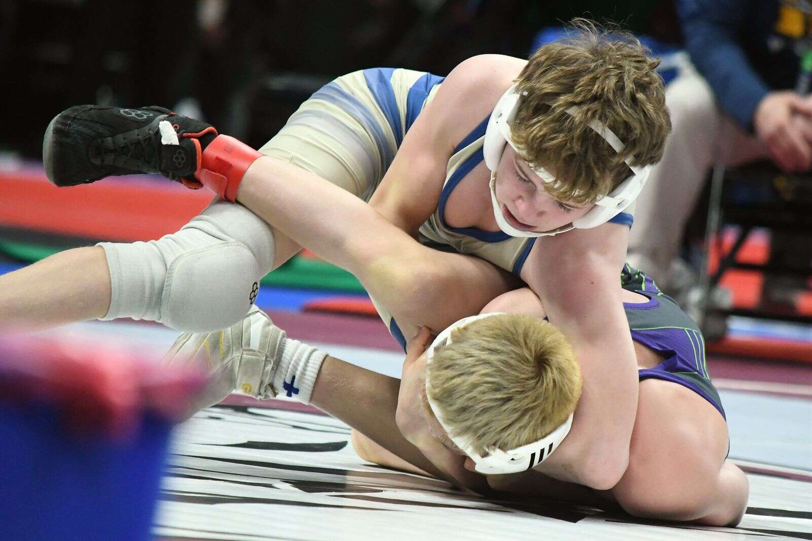 Dove Creek 106-pounder Keaton Banks latches firmly onto the leg of Yuma's Cooper Blach Friday at the 2026 CHSAA Class 2A State Championships inside Ball Arena in Denver. Banks won 8-3 to survive into the next consolation round.Joel Priest/Special to The Journal