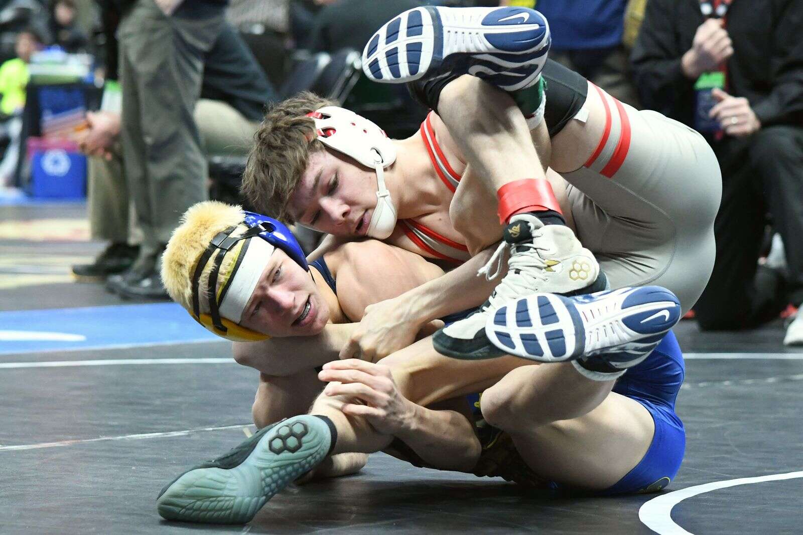 Mancos' Traycer White stares in at Monte Vista's Stetson Romero during 120-pound action Thursday at the 2026 CHSAA Class 2A State Championships inside Ball Arena in Denver. White won by pin to advance into the weight's quarterfinals.Joel Priest/Special to The Journal