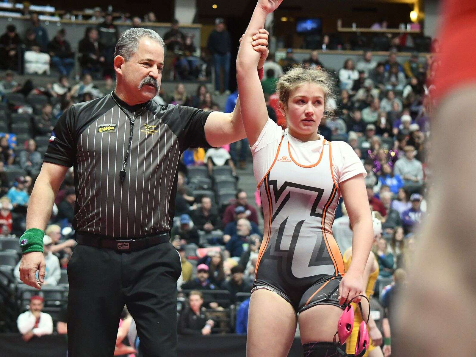 Montezuma-Cortez's CeJae Snyder is presented to all inside Ball Arena in Denver after pinning Moffat County's Natalia Quezada on Day 3--Saturday, February 21--of the 2026 CHSAA Class 4A Girls' State Championships. Snyder's victory earned her fifth place within the 115-pound division.Joel Priest/Special to The Journal