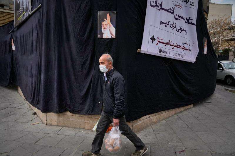 AA man carrying groceries walks by a picture of the late Iranian Supreme Leader Ayatollah Ali Khamenei hanging on a black sheet along the side of a mosque in Tehran, Iran, Monday, March 2, 2026. (AP Photo/Vahid Salemi)