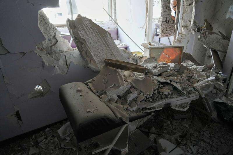 Debris is seen in a room of Gandhi Hospital, which was damaged when a strike hit a state TV communications tower and nearby buildings across the street during the ongoing joint U.S.-Israeli military campaign in Tehran, Iran, Monday, March 2, 2026. (AP Photo/Vahid Salemi)