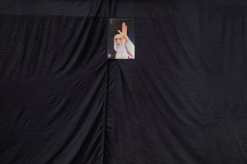 A picture of the late Iranian Supreme Leader Ayatollah Ali Khamenei hangs on a black sheet along the side of a mosque in Tehran, Iran, Monday, March 2, 2026. (AP Photo/Vahid Salemi)