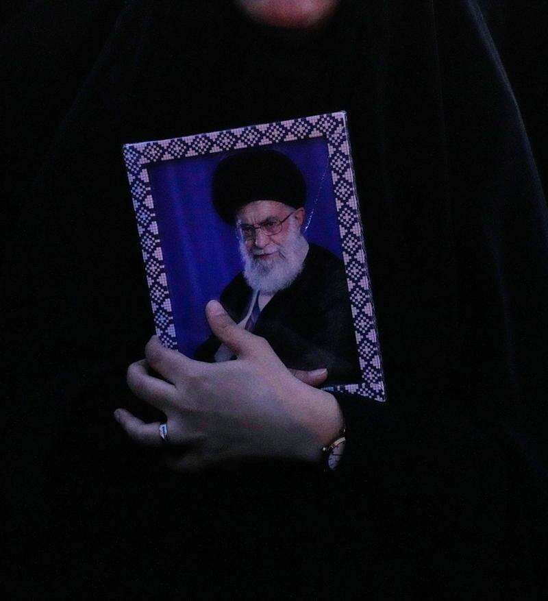 A government supporter holds a picture of the Iranian Supreme Leader Ayatollah Ali Khamenei during a gathering after state TV officially announced the death of Khamenei, in Tehran, Iran, Sunday, March 1, 2026. (AP Photo/Vahid Salemi)