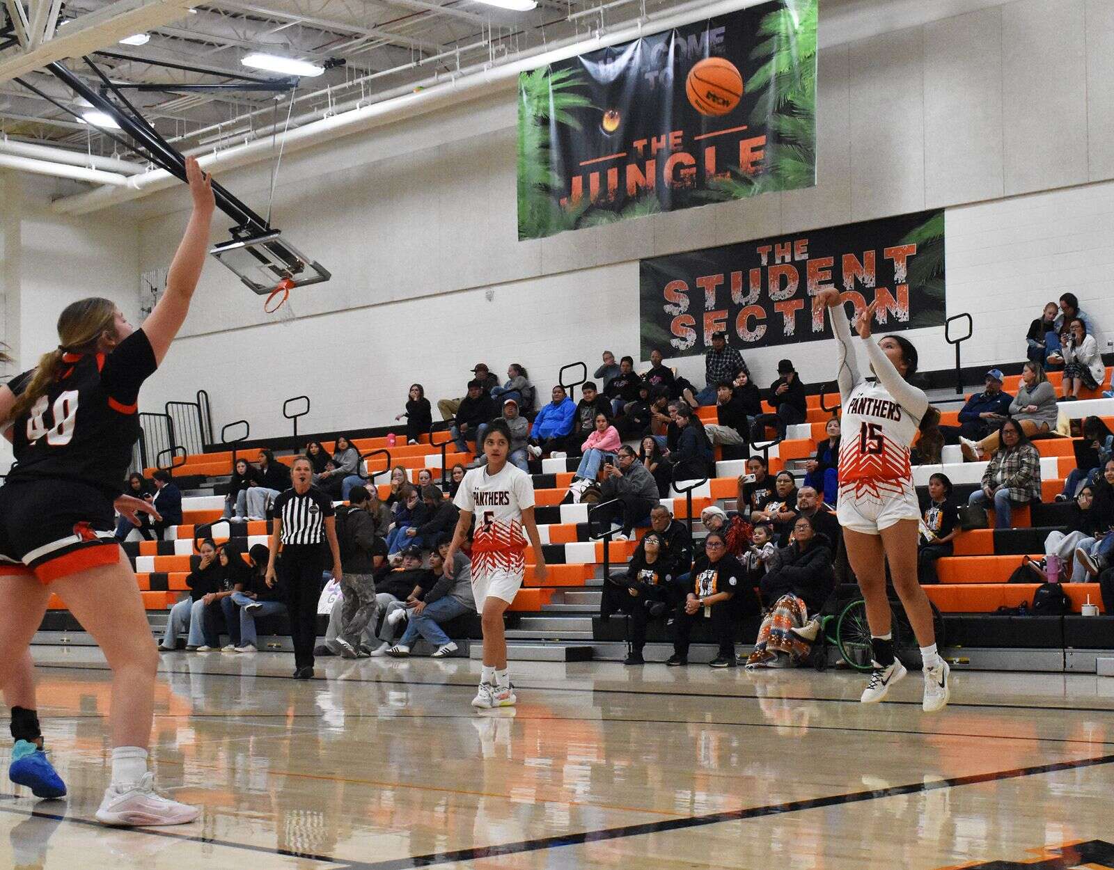 M-CHS freshman Kimberly Leonard launches a three-point attempt in the Panthers home opening contest against Ouray. Erika Alvero/Special to The Journal