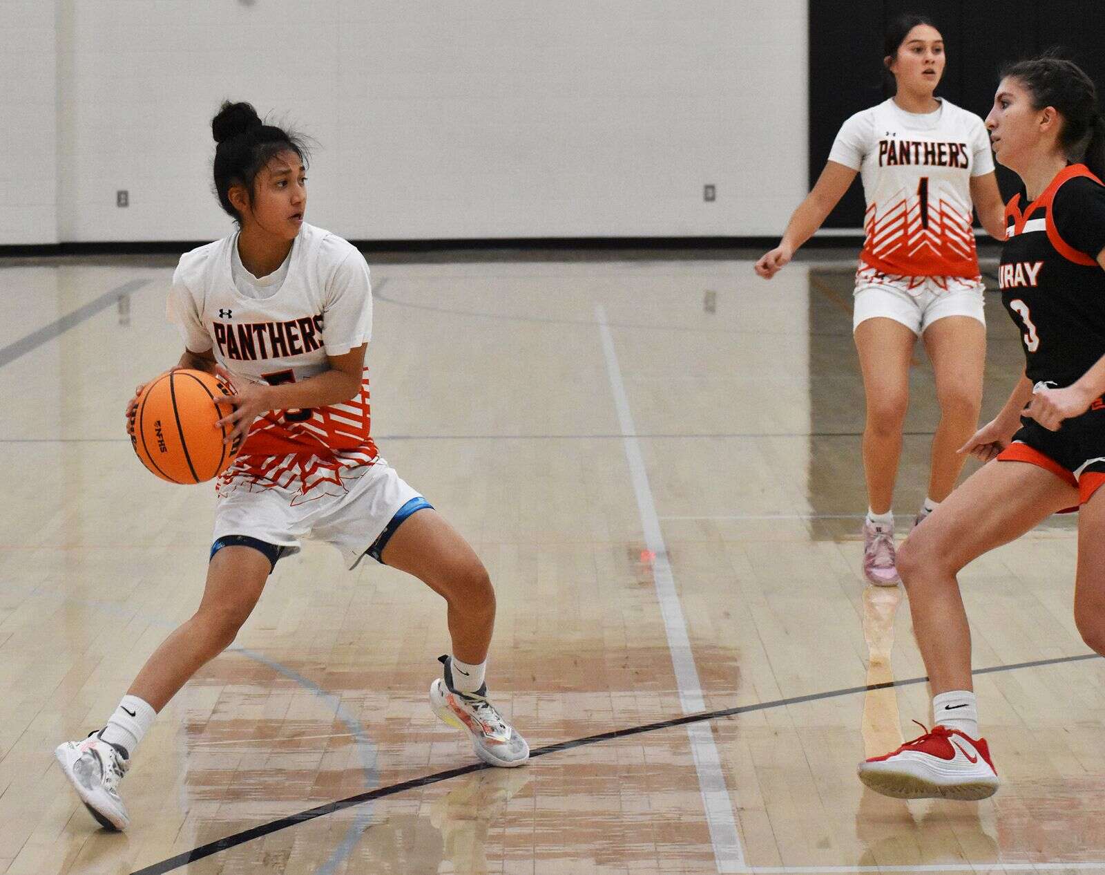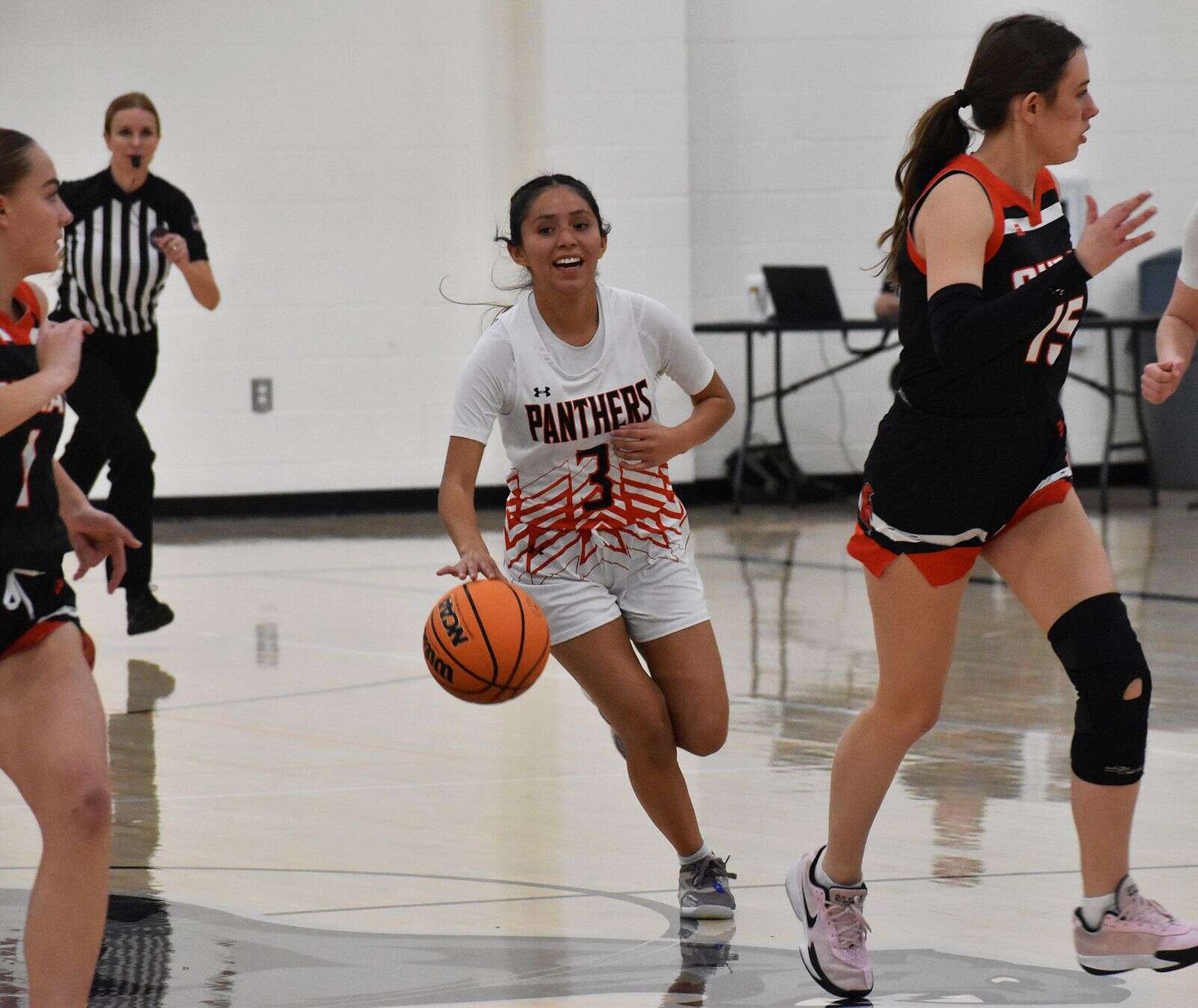 M-CHS junior Abigale Baker brings the ball upcourt in the Panthers home opening contest against Ouray. Erika Alvero/Special to The Journal
