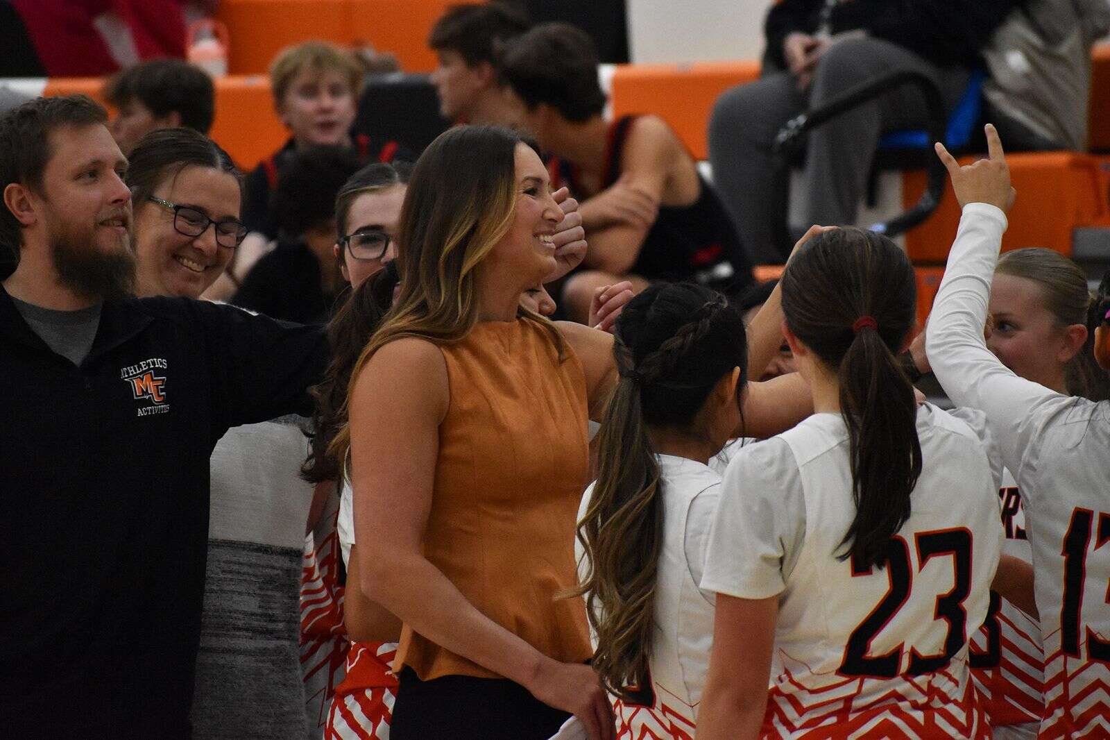 M-CHS head coach ME Haley celebrates with her team after some strong play from her Panthers in a contest against Ouray. Erika Alvero/Special to The Journal