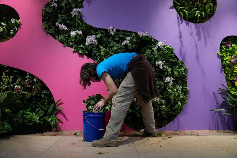 Brook Nelson tends to a wall of plants as finishing touches are placed on the 12th annual Chicago Botanic Garden Orchid Show, Friday, Feb. 6, 2026, in Glencoe, Ill. (AP Photo/Erin Hooley)