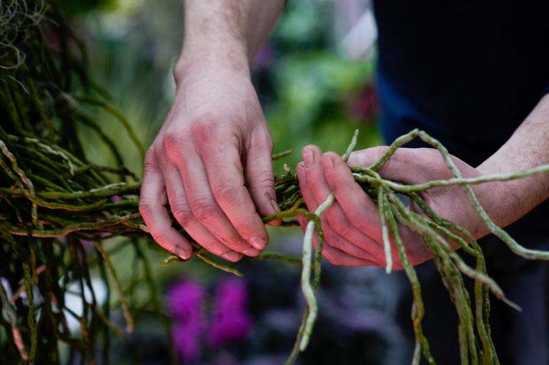 Exhibits horticulturist Jason Toth holds the roots of a large Vanda orchid as finishing touches are placed on the 12th annual Chicago Botanic Garden Orchid Show, Friday, Feb. 6, 2026, in Glencoe, Ill. (AP Photo/Erin Hooley)