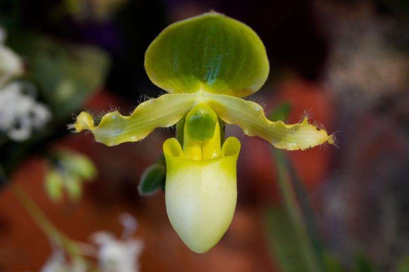 A Paphiopedilum orchid is on display as finishing touches are placed on the 12th annual Chicago Botanic Garden Orchid Show, Friday, Feb. 6, 2026, in Glencoe, Ill. (AP Photo/Erin Hooley)