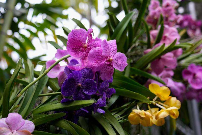 Vanda orchid leaves grow as finishing touches are placed on the 12th annual Chicago Botanic Garden Orchid Show, Friday, Feb. 6, 2026, in Glencoe, Ill. (AP Photo/Erin Hooley)