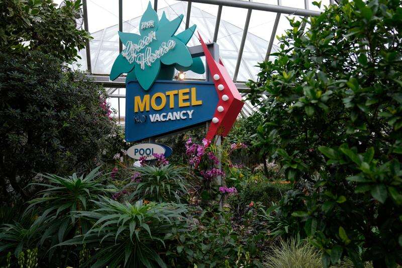 A motel sign is displayed as finishing touches are placed on the 12th annual Chicago Botanic Garden Orchid Show, Friday, Feb. 6, 2026, in Glencoe, Ill. (AP Photo/Erin Hooley)