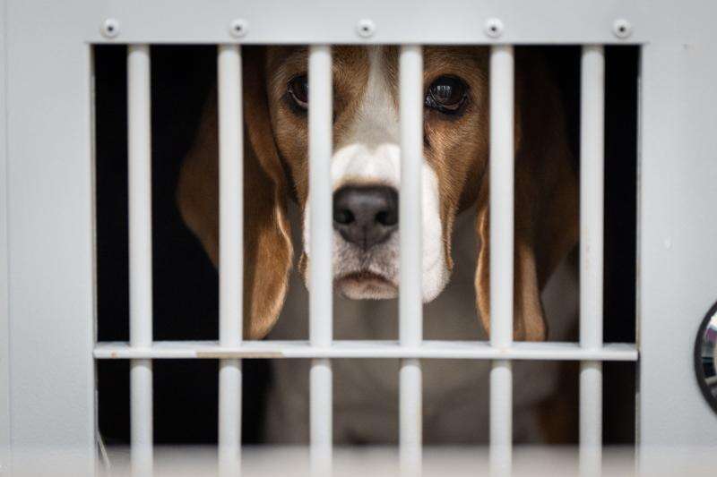 A beagle sits in his crate at the 150th Westminster Kennel Club Dog Show, Monday, Feb. 2, 2026, in New York. (AP Photo/Angelina Katsanis)