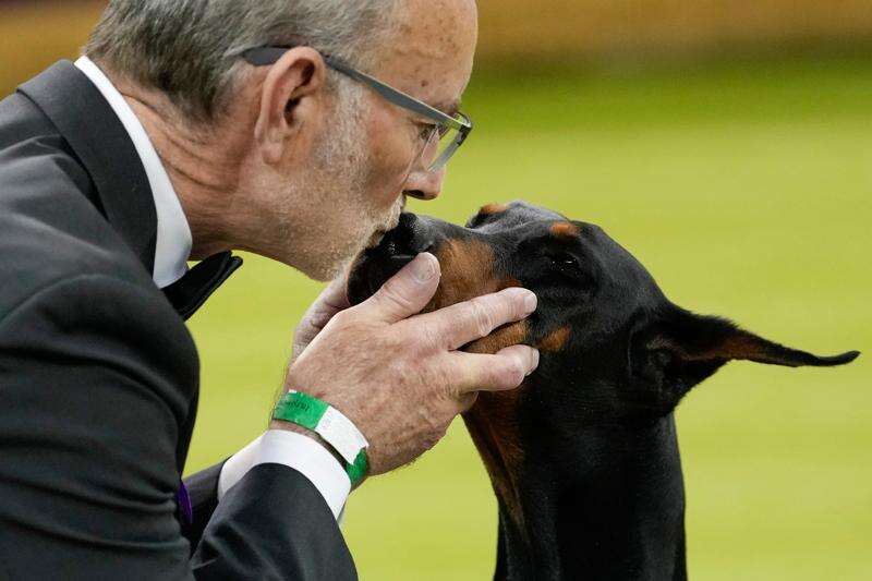 Penny, a doberman pinscher, poses for photos after winning Best in Show of the 150th Westminster Kennel Club Dog Show, Tuesday, Feb. 3, 2026, in New York. (AP Photo/Yuki Iwamura)