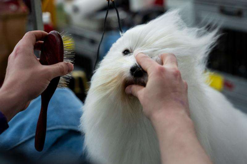 A groomer prepares their dog at the 150th Westminster Kennel Club Dog Show, Monday, Feb. 2, 2026, in New York. (AP Photo/Angelina Katsanis)