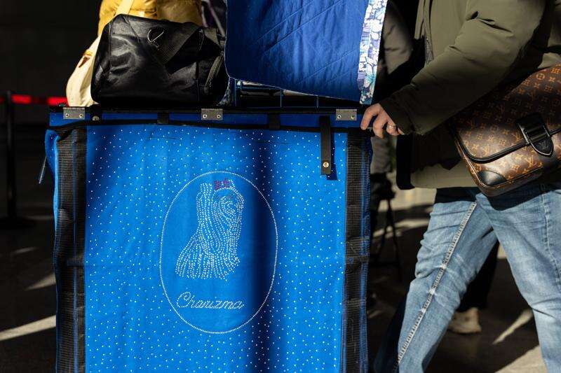 A carrier transporting show dog Charizma is pushed by her handler at the 150th Westminster Kennel Club Dog Show, Monday, Feb. 2, 2026, in New York. (AP Photo/Angelina Katsanis)