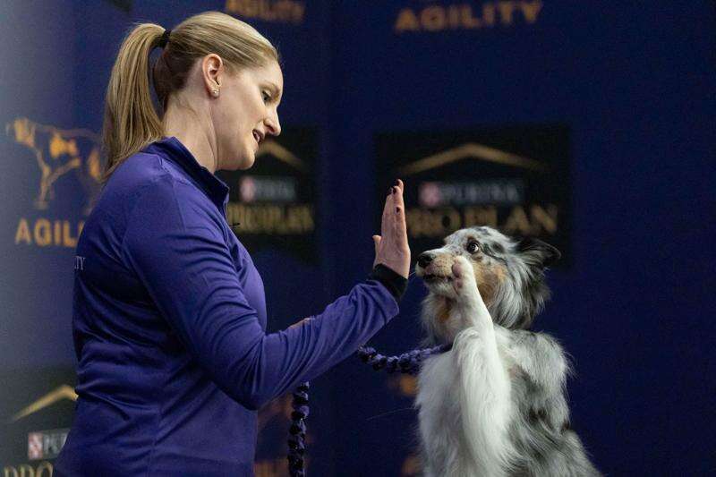 An Australian Shepherd dog gives a high-five to a handler before competing in the Masters Agility Championship Finals at the 150th Westminster Kennel Club Dog show, Saturday, Jan. 31, 2026, at the in New York. (AP Photo/Yuki Iwamura)