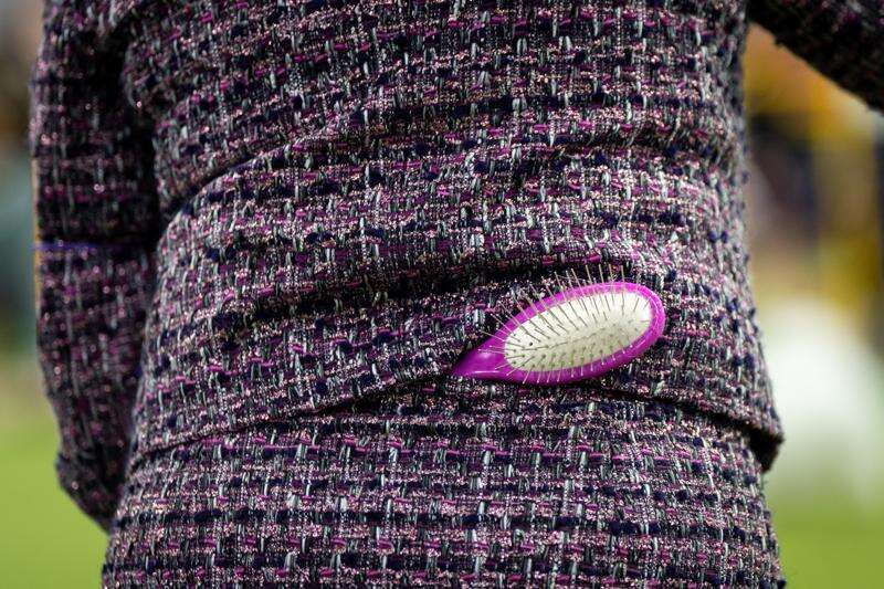 A handler keeps a dog brush in her skirt waistline while showing her dog at the 150th Westminster Kennel Club Dog Show, Monday, Feb. 2, 2026, in New York. (AP Photo/Angelina Katsanis)
