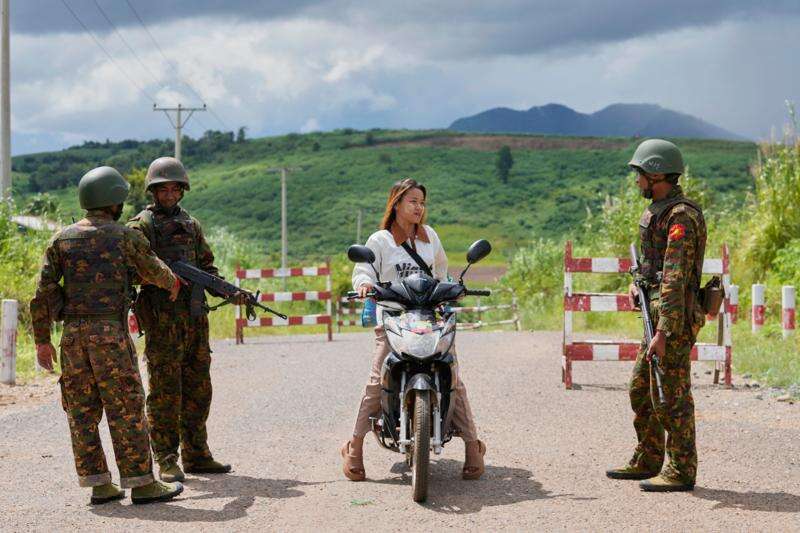 In this photo taken during a trip supervised by pro-military Myanmar media, soldiers stand guard at a check point in Kyaukme, northern Shan State, Myanmar, Friday, Oct. 10, 2025. (AP Photo/Aung Shine Oo)